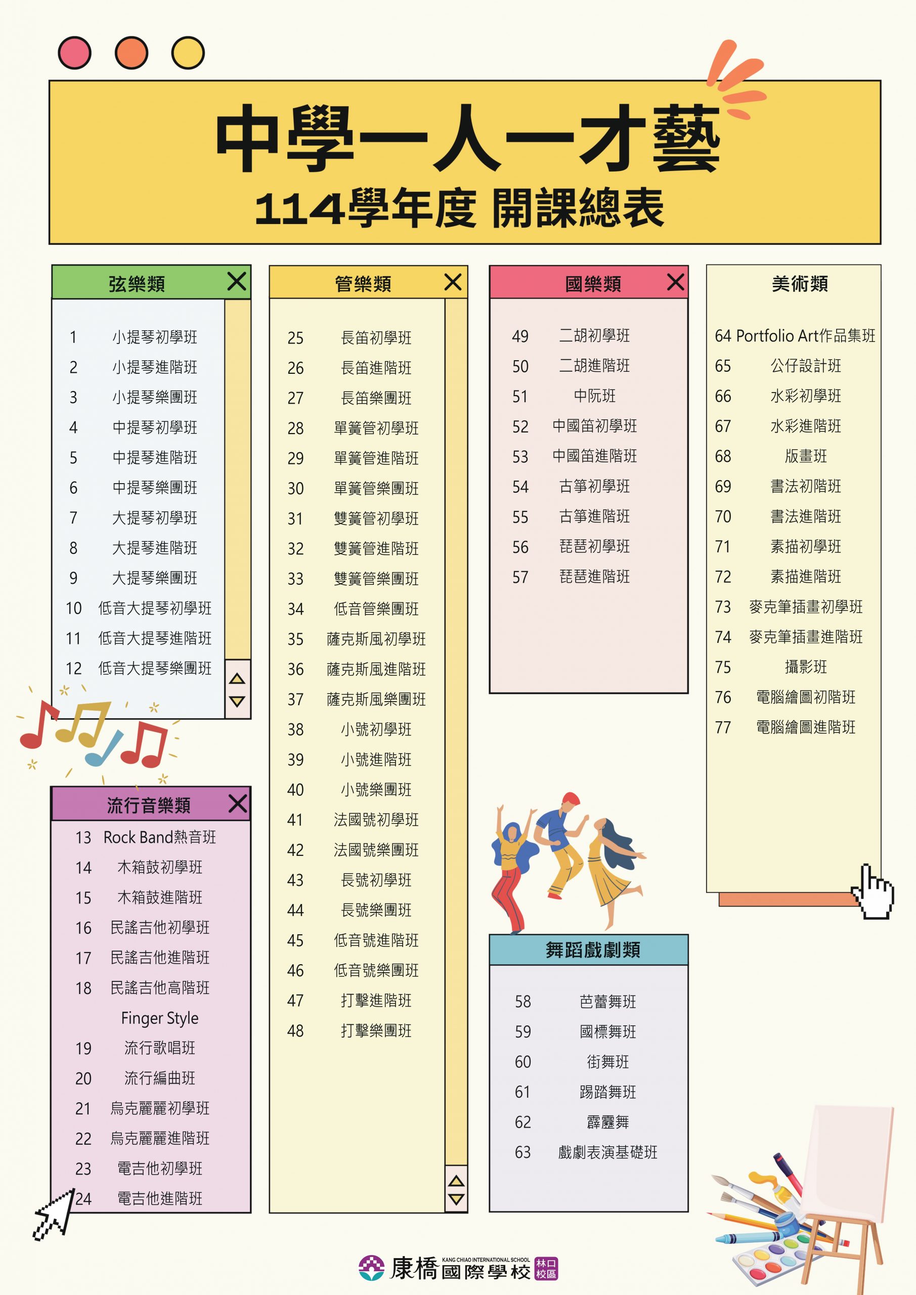 一人一才藝、藝術護照 一人一才藝課程 中學致力推動每週二節「一人一才藝課程」,每年度開設120門課程供學生選擇。以藝術鑑賞為起點,其課程內容包含「管樂、弦樂、流行音樂、美術、舞蹈戲劇、國樂」,落實適性揚才。學生透過表現、鑑賞與實踐的三個學習構面,成就每一位孩子,落實藝術的札根與推廣,奠定學生藝術鑑賞能力、涵養高尚氣質。 管弦打擊音樂類 Classical Music 小提琴、中提琴、大提琴、低音提琴、長笛、單簧管、雙簧管、薩克斯風、低音管、小號、長號、法國號、上/低音號以及打擊樂器。樂器類課程將依學生程度進行分班,聘請國內外優秀師資,有系統的課程規劃,無論你是初學或者是已有數年的學習經歷,都可以在這裡找到適合你的班級!另外,學校也提供特殊樂器租借,我們鼓勵孩子透過這個機會學習一樣新的技能,培養帶得走的軟實力。 流行音樂類 Popular Music 熱音、民謠吉他、烏克麗麗、電吉他、流行編曲。除了古典的音樂類課程,我們也鼓勵孩子可以選擇流行類的音樂,開拓多元廣泛的音樂技能與知識。此類課程是每學期快閃表演的受歡迎節目呢! 美術類 Fine Arts 素描、水彩、書法、室內設計、麥克筆、電腦繪圖、公仔設計、版畫、作品集。每年約有40%中學生選擇美術類的課程,開設對廣度高的美術設計課程,除累積美感素養,亦培養學生兼具升學生涯發展的能力。 舞蹈戲劇類 Dancing & Drama 現代舞、國標舞、芭蕾舞、街舞、霹靂舞、基礎表演。表演藝術是透過肢體與聲音的表達、聯想與創意的發揮、戲劇與舞台的演出、讓觀眾欣賞最具活力與生命力的肢體表演 國樂類 Chinese Music 二胡、古箏、琵琶、中阮、中國笛、嗩吶、揚琴。樂器類的課程除了古典的、流行樂類的音樂課程,我們也鼓勵孩子可以選擇國樂類課程,開拓多元廣泛的音樂技能與知識,定期有國樂合奏的演出。 藝術護照 一、實施目的: 藉由藝術護照的推展,培養學生於生活中養成藝術鑑賞的好習慣,能主動涉獵各類型的展演活動,例如觀賞美術展覽、聆聽音樂會、欣賞舞蹈表演等,提升藝術涵養 與氣質,讓一人一才藝課程目標達到最佳成效,達藝術即生活之終極目標。 二、實施時間: 藝術護照上學期認證截止日為 12/31(上學期範圍起始日為 6/1~12/31 含暑假); 藝術護照下學期認證截止日為 5/31(下學期範圍起始日為 1/1~5/31 含寒假)。 三、實施方式: (一) 須於每學期完成在校外辦理的正式公開展演,靜態視覺藝術及動態聽覺/表演藝術欣賞各一場。若學生於海外參與相關藝文展演欣賞,亦可上傳紀錄作為認證 (二) 靜態與動態說明: 視覺藝術(靜態):如繪畫、攝影、雕刻、空間設計展等。 音樂、表演藝術(動態):如音樂會、歌劇、舞台劇、舞蹈、相聲等。 紀錄片、電影、演唱會、歷史古蹟、科學、運動等非藝術性質的活動不列入認證。 四、認證方式: (一) 至學生系統【獎懲、銷過、服務學習與藝術護照系統】線上操作,上傳認證資料。 (二) 上傳內容: 填妥班級、學號、姓名、展演地點、展演名稱。 兩張佐證照片: 照片1:含票券存根照片 1 張,若無票根,則須提供本人與現場其他照片 (如活動背板與日期),並撰寫150字心得佐證。 照片2:學生在現場照片1張 (與展演宣傳海報拍照或現場本人手拿票根之照片)。 (三) 推廣中心審核後,可依據行事曆時間定期公告日進學生系統回查認證狀態。 五、分數計算:佔一人一才藝學期總平均分數之 10 分。靜態與動態認證各佔 5 分,共計 10 分 。